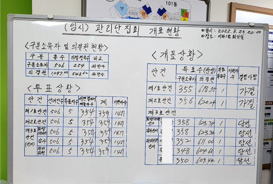 서면 결의서를 아직 제출하지 않으신 분은 오늘 저녁에 제출해 주시고 내일 오전 8시부터는 현장투표(본 투표) 가 관리사무소에서 진행되니 현장 투표를 하시면 됩니다. 그리고 구분소유자 중에서 두 분의 선거참관인이 필요하다고 합니다. 서면결의서를 제출하신 분들도 내일 저녁 8시에 시작되는 집회에 많이 참석해 주시길 부탁드립니다:” 라는 당시 집회 참여의 애절한 호소가 돋보였다.