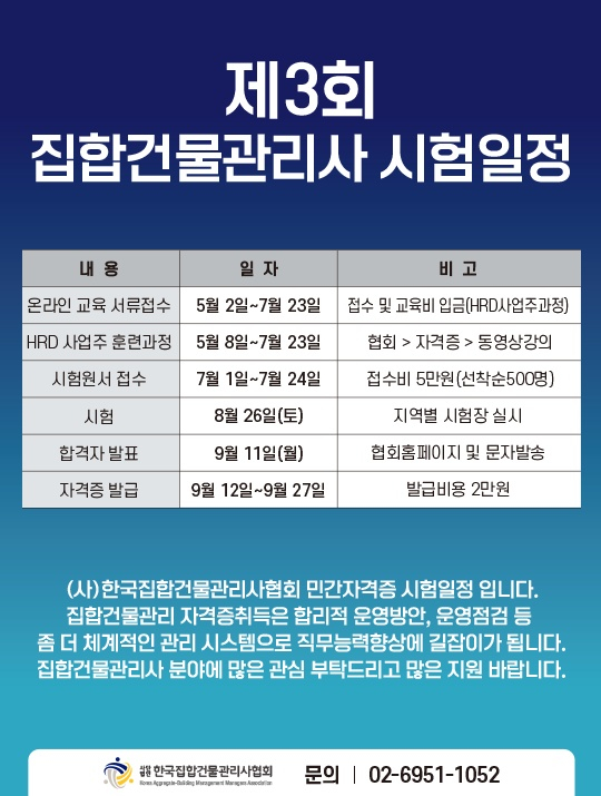 향후 유망직종 중 하나인 제2의 직장 은퇴 후 집합건물관리사 자격증이 가장 각광 받을 것으로 예상된다고 협회 관계자는 전했다. 5월 2일 부터 한국집합건물관리사협회 홈페이지에서 온라인 교육 접수와 자격증 시험 접수도 받는다고 했다.