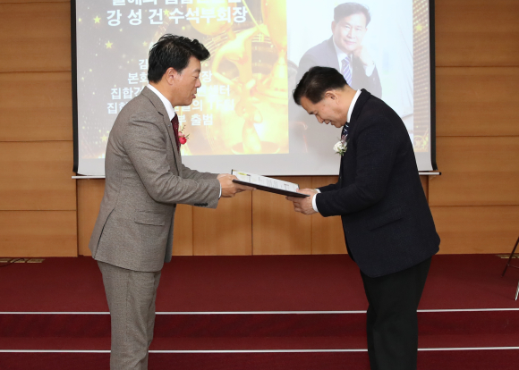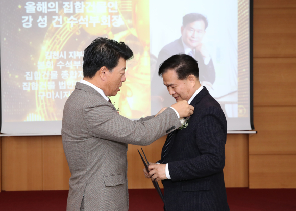 마지막으로 한국집한건물인으로 선정된 강성건 수석부회장은 김천지회 회장역할도 맡아 일하고 있으며 집한건물법 개정 발의안팀의 운영위원장 직을 맡고 있다. 부상으로 순금 뺏지를 하사받았다.