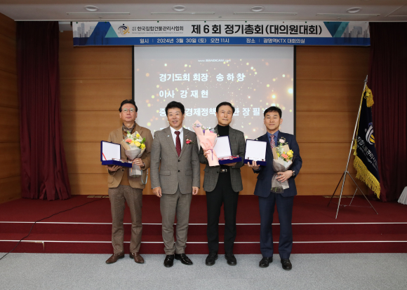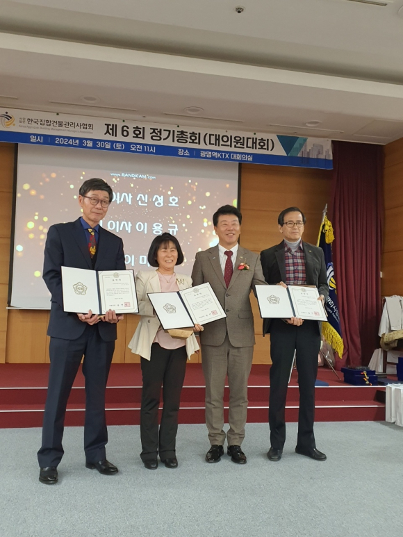한국집합건물 관리사 협회 박인규 회장의 감사패는 경기도회 송하창 회장, 강재현 이사, 중량구 경제정책 장필수 자문관, 전병식 교육원장께 수여했다.
