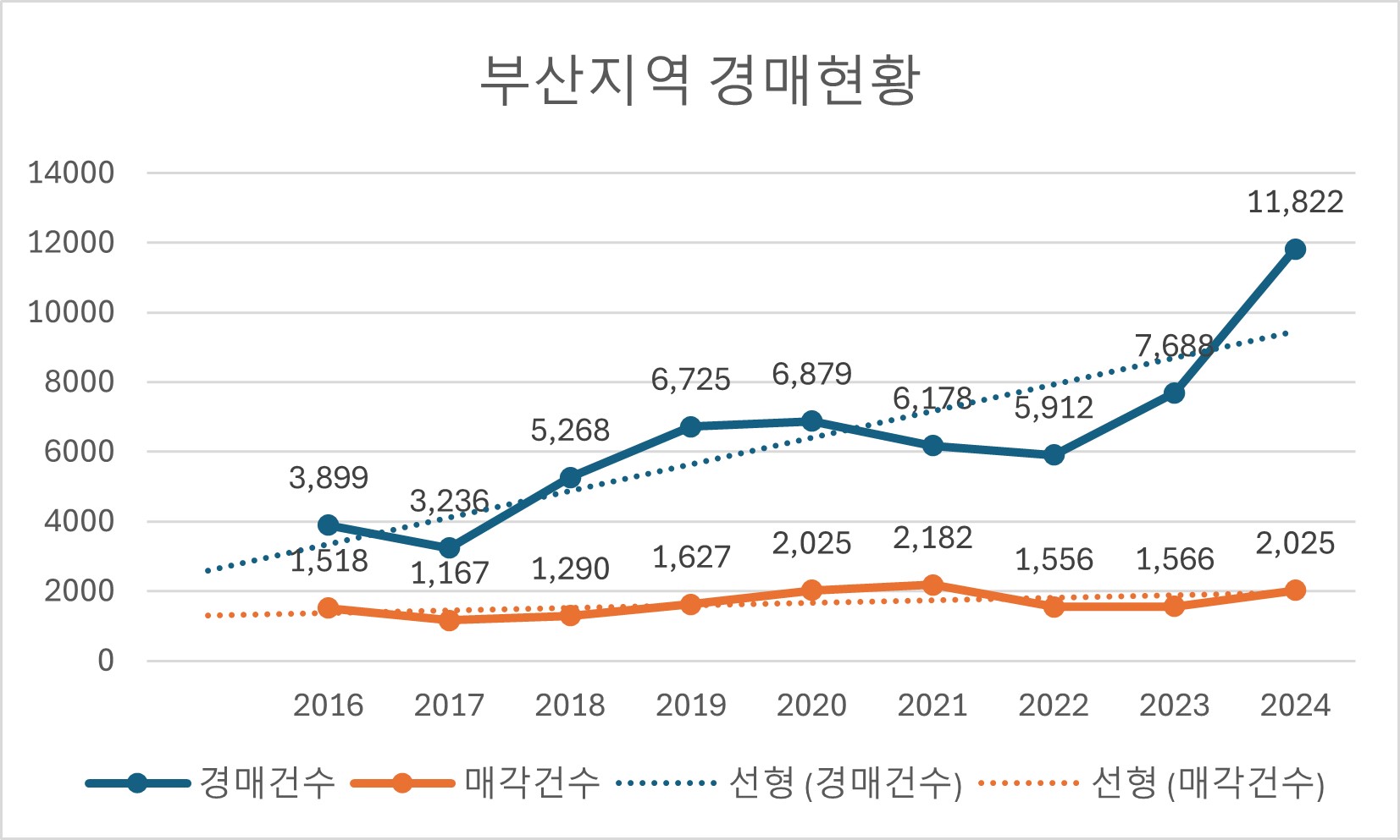 부산 경매 시장의 흐름을 살펴보면, 2016년부터 경매건수는 꾸준히 증가하는 추세를 보였다. 특히 2019년부터 2020년 코로나19 팬데믹 기간 동안 경매건수가 급증했다가, 이후 소폭 감소한 뒤 다시 증가세로 돌아섰다. 이 시기에는 경제 불확실성으로 인해 부동산 시장이 침체를 겪으면서, 경매 물건이 증가한 것으로 보인다. 매각건수는 이 기간 동안 상대적으로 낮은 수준에서 유지되었고, 시장의 불확실성이 반영된 결과로 풀이된다.