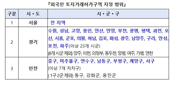 □ 국토교통부(장관 김윤덕)는 8월 21일 중앙도시계획위원회 심의를 거쳐 서울시 전역, 인천시 및 경기도 주요 지역을 외국인 토지거래허가구역*(이하 “허가구역”)으로 지정한다.