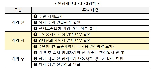 ㅇ 안심계약 3‧3‧3법칙에 따르면, 우선 계약 전 주변 시세를 충분히 조사하고, 등기사항전부증명서(등기부등본) 등을 통해 임차할 주택의 권리관계를 꼼꼼히 확인하며, 전세보증보험 가입이 가능한 집인지 보증사를 통해 문의하는 것이 중요하다는 것을 알 수 있다.
