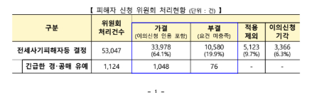 □ 그간 위원회에서 최종 결정한 전세사기피해자등은 총 33,978건(누계), 긴급 경・공매 유예 협조요청 결정은 총 1,048건(누계)으로, 결정된 피해자등에게는 주거, 금융, 법적 절차 등 총 44,181건(누계)을 지원하고 있다.
