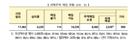 ㅇ ’25년 9월 23일 기준으로 피해자로부터 총 17,482건의 피해주택 매입 사전협의 요청이 들어왔으며, 이 중 8,482건은 현장조사 등 매입 심의가 완료되어 피해자에게 매입이 가능함을 알렸다.