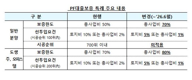 □ 먼저, PF대출 보증 한도를 총사업비의 50%에서 70%로 상향하고, 시공사의 시공순위 제한을 폐지하는 등 보증요건 완화 특례를 1년 연장함으로써 PF시장 경색에 따른 주택사업자의 자금조달 애로를 해소한다.