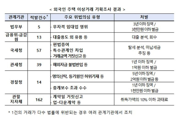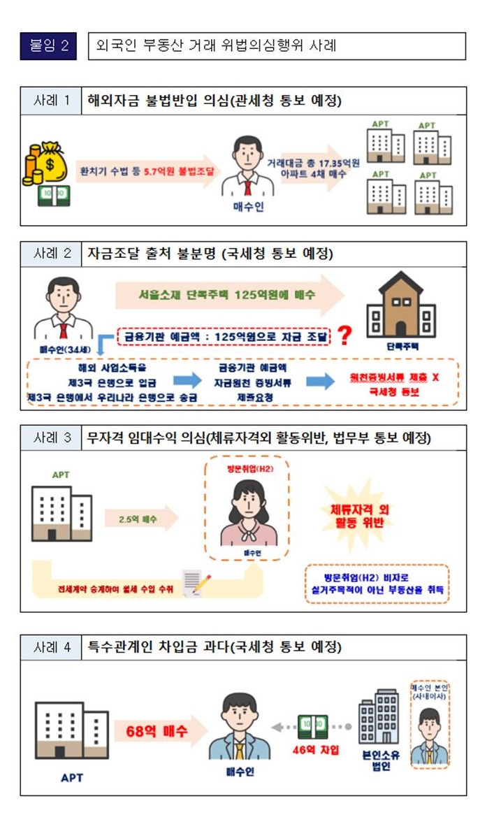 ㅇ 아울러 외국인 위법행위에 대한 법적제재 조치 상향을 관계부처간 논의하고, 자금조달계획서에 해외자금 조달내역도 포함*하는 한편, 탈세 혐의 및 의심거래에 대해서도 본국으로 적극 통보하기로 하였다.