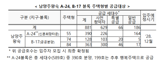 < 남양주왕숙 A-24, B-17 블록 주택형별 공급대상 >