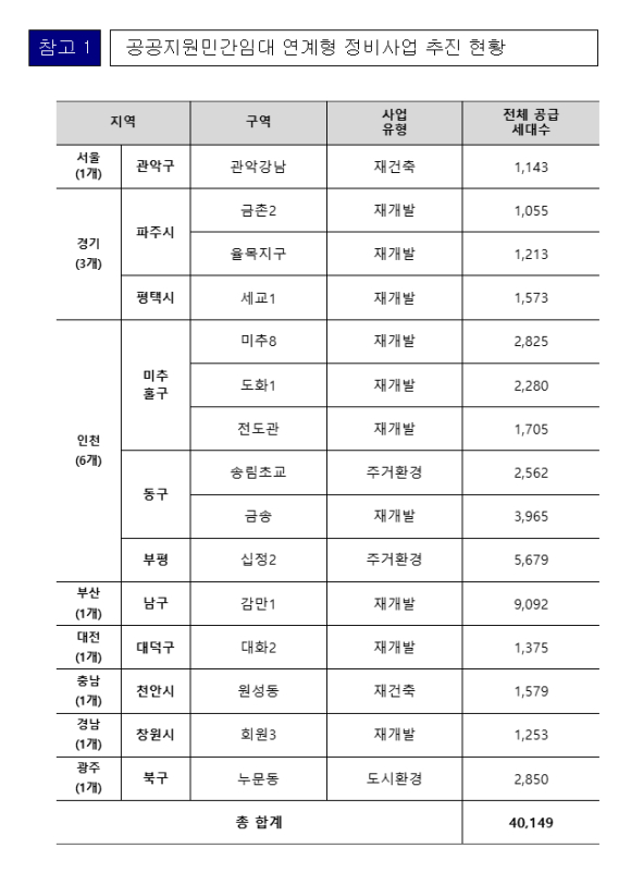 □ 국토교통부(장관 김윤덕)는 공공지원민간임대 연계형 정비사업(이하 연계형 정비사업)이 원활히 추진되도록, 임대주택 매매가격 산정기준을 합리적으로 조정하고 일반 분양을 일부 허용하는 등 제도를 개선한다.