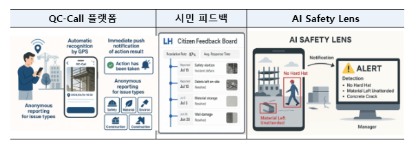 ㅇ 현장 안전·품질 문제를 실시간, 익명 제보할 수 있는 QC-Call(QC: Quality Check) 플랫품을 구축하여 제보 이미지에서 위험요소를 자동 인식하고 제보내용ㆍ조치과정을 타임라인 형태로 공개하여 보이는 품질관리를 실현하는 방안이다.