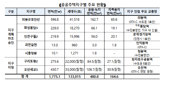 □ 국토교통부(장관 김윤덕)는 12월 31일(수) 경기도 의왕시, 군포시, 안산시, 화성시 및 인천광역시 남동구 등 총 5곳 1,069만㎡(총 7.8만호)의 공공주택지구의 지구계획을 최초로 승인하고, 경기도 구리시와 오산시 총 2곳 706만㎡(총 5.5만호)를 공공주택지구로 지정한다.
