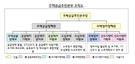 □ 공급본부는 21년째 임시조직(별도조직)으로 운영되어 온 국장급 조직인 공공주택추진단을 중심으로, 택지 개발(공공주택추진단), 민간 정비사업(주택정책관), 노후 계획도시 재정비(도정비기획단) 등 국토부 내 분산된 주택공급 기능을 하나로 모아 만든 실장급 주택공급 전담 조직이다.