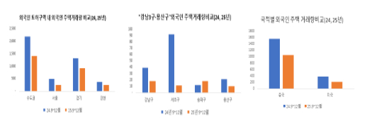 □ 국토교통부(장관 김윤덕)는 주요 외국인 토지거래허가구역을 대상으로 ’24년 9월~12월과 ’25년 같은 기간(9월~12월, 토지거래허가구역 지정 이후) 주택거래량을 분석한 결과, 거래량이 일제히 감소한 것으로 나타났다고 밝혔다.