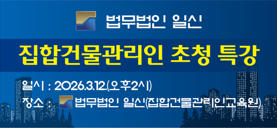 아울러 당 법무법인 일신은 집합건물 관리인들의 권익보호 법정 단체가 없는 것이 안타까워 관리인들을 보호하고 전문적 자질을 갖추기 위한 단체인 'NGO 대한집합건물관리인협회(가칭)' 창립에 앞서 협회의 설립 취지와 목적에 깊이 공감하여, 협회의 안정적 출범을 지원하고자 관련 법률 · 제도적 기반 마련을 위한 사전 준비단계로 관리인 대상 초청 특강을 진행하게 되었다.