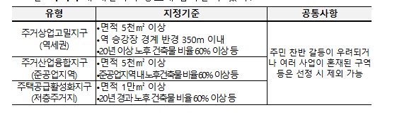 ㅇ 노후도·면적 등 하단의 사업유형별 지정기준을 충족한 지역의 주민은국토교통부 누리집(www.molit.go.kr)에 공고된 신청서류를 사업지가 속한 자치구에 제출하여 공모에 참여할 수 있다.