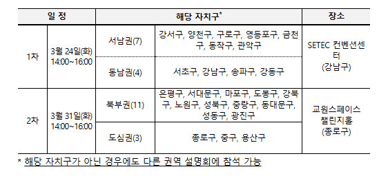 □ 아울러, 국토부는 후보지 공모에 대해 주민들과 자치구에 상세히 안내하기 위해 3월 24일(화), 3월 31일(화) 2차례에 걸쳐 권역별 찾아가는 설명회도 개최할 계획이다.