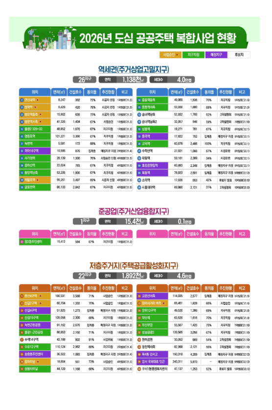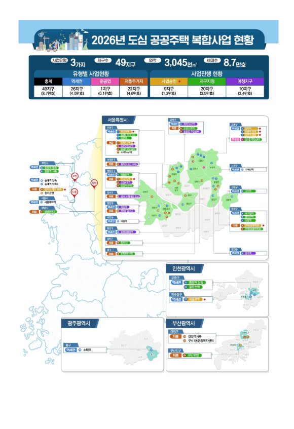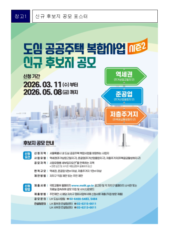 □ 국토교통부(장관 김윤덕)는 도심 내 추가 주택 공급을 위해 도심 공공주택 복합사업(이하 ‘도심복합사업’) 신규 후보지 공모를 3월 11일(수)부터 실시한다. 공모 대상지는 서울이며 그 외 지역은 하반기에 추가로 공모할 예정이다.