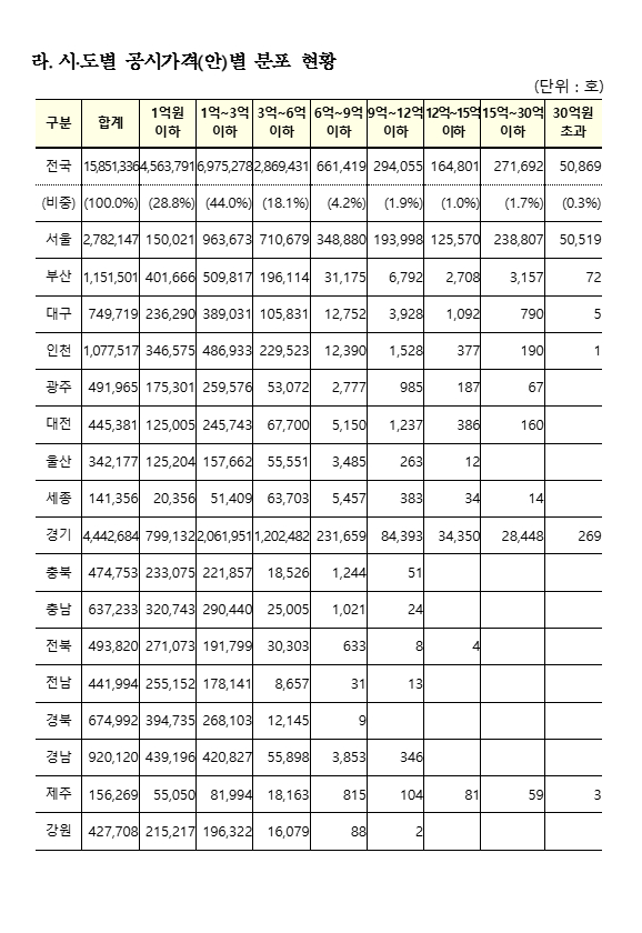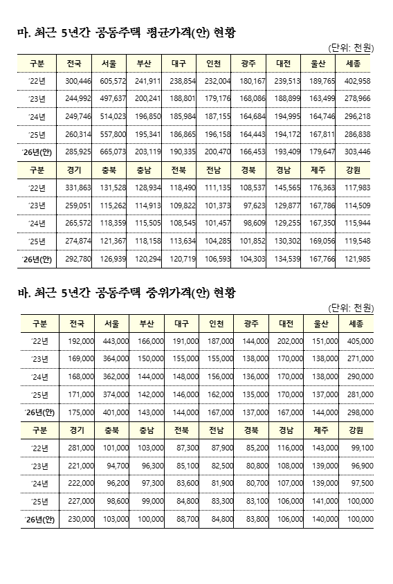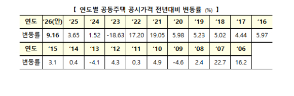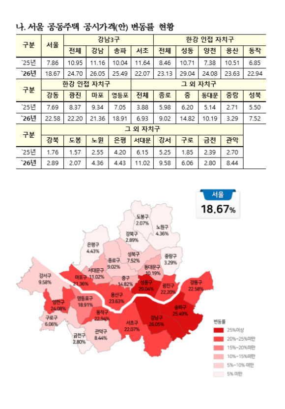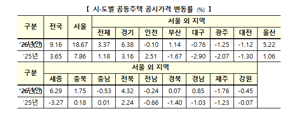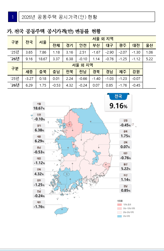 ㅇ ‘26년 공동주택은 약 1,585만 호이며, ‘26년 공동주택 공시가격(안)은 ‘25년 대비 전국 평균 9.16% 상승하였다. 이는 서울 일부 지역의 고가아파트의 가격 상승분 등이 반영된 결과이다.