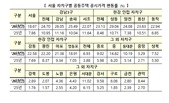 ㅇ 특히, 서울(18.67%) 내에서도 고가아파트가 밀집한 강남, 송파, 서초 등 강남3구의 상승률은 24.7%, 성동, 용산 등 한강 인접 자치구*의 상승률은 23.13%, 그 외 자치구**의 상승률은 6.93%이다.