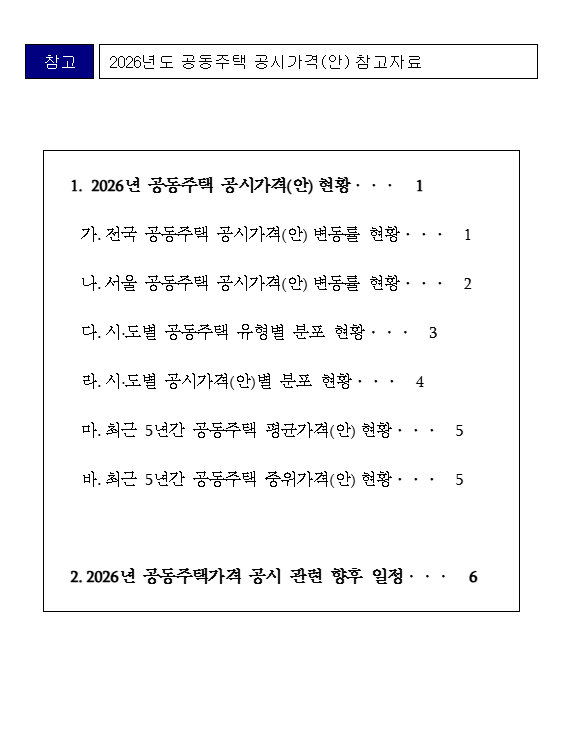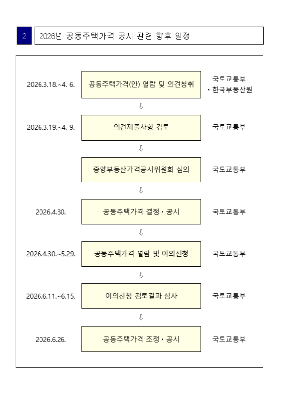 □ 국토교통부(장관 김윤덕)는 ‘26년 1월 1일 기준으로 조사ㆍ산정한 공동주택(약 1,585만호)의 공시가격(안)에 대한 소유자 열람 및 의견청취 절차를 ‘26년 3월 18일(수)부터 ‘26년 4월 6일(월)까지 20일간 진행한다.