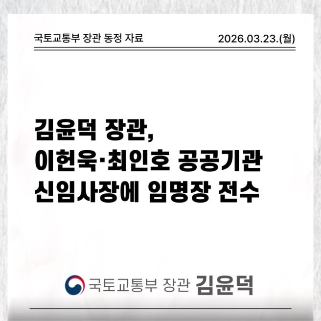 □ 김윤덕 국토교통부 장관은 3월 23일(월) 오전 10시 한국부동산원 원장과 주택도시보증공사 사장에게 임명장을 전수하였다.
