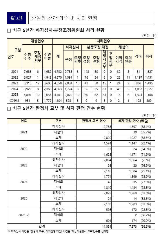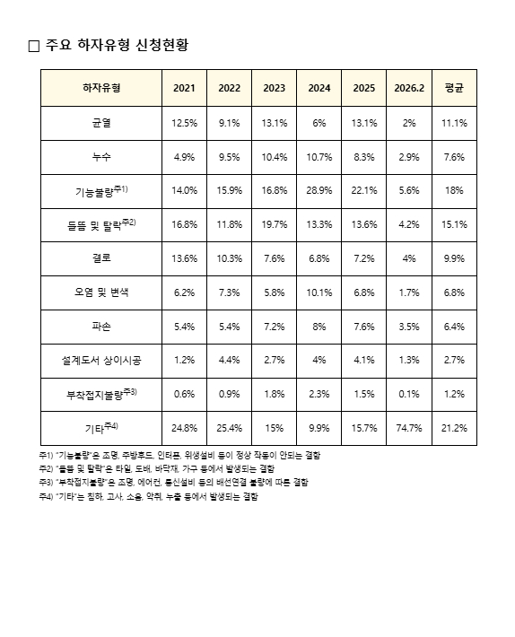 ㅇ 공동주택의 하자 여부를 판정하는 ‘하자심사’는 ’21년부터 ’26년 2월까지 총 10,911건이 신청되었고, 하심위로부터 실제 하자로 판정받은 비율(하자판정 비율)은 68.3%(7,448건)로 나타났다.