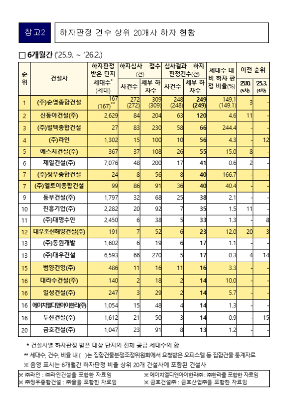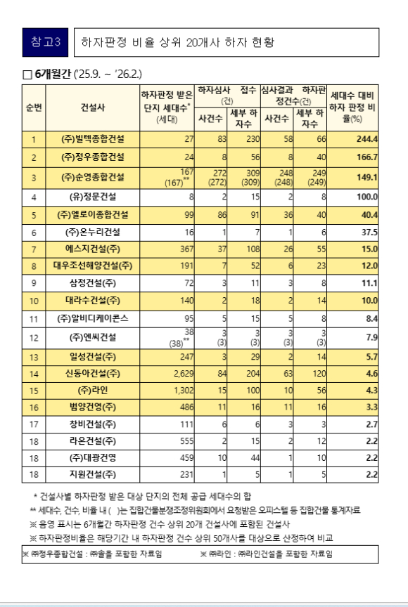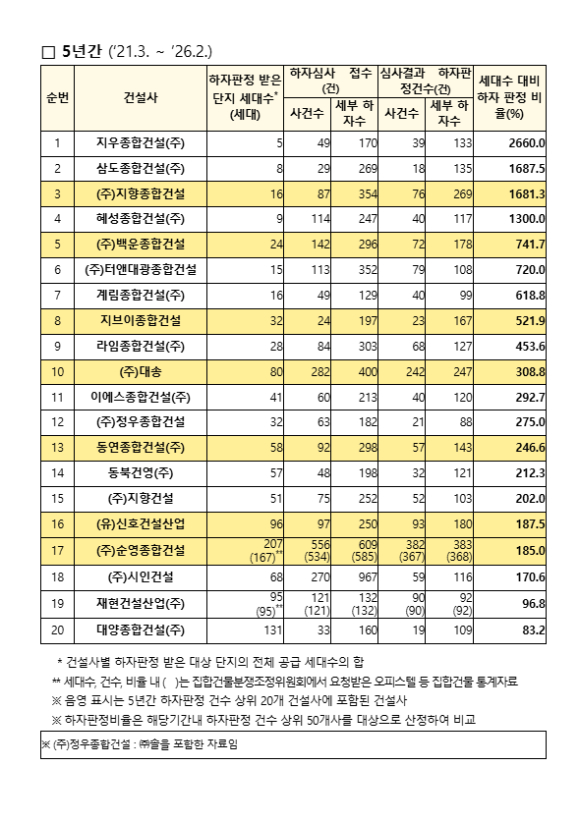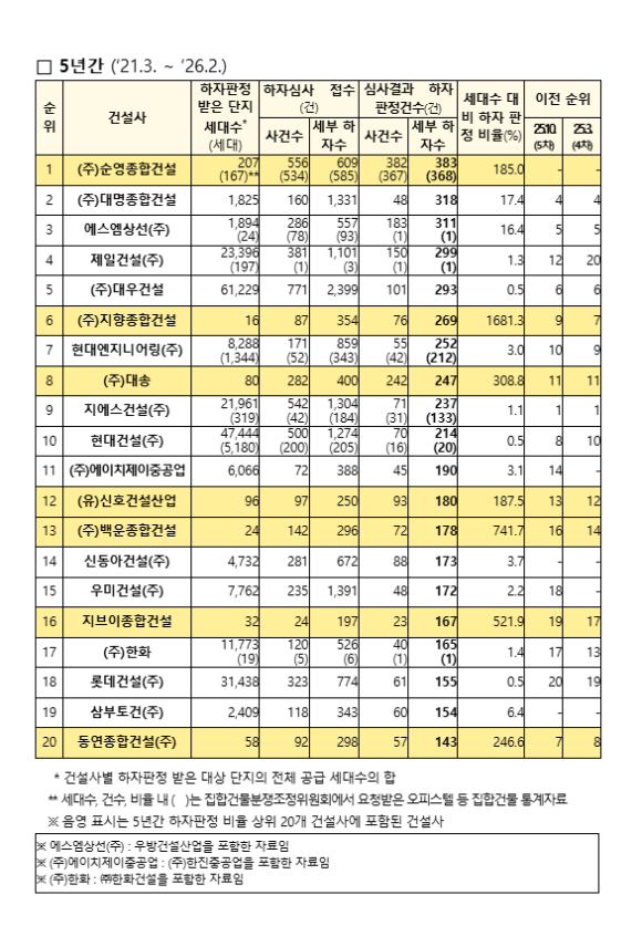 ㅇ 최근 5년(’21.3~’26.2) 누계 기준으로는, (주)순영종합건설(383건, 세부 하자수 기준), (주)대명종합건설(318건), 에스엠상선(주)(311건), 제일건설(주)(299건), (주)대우건설(293건) 순으로, 대형 건설사의 세부 하자 수 감소에 따라 그간 1차 발표(’23.9)부터 유사했던 상위 건설사 순위가 금번 발표 시 크게 변동된 것으로 나타났다.