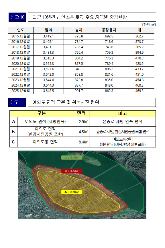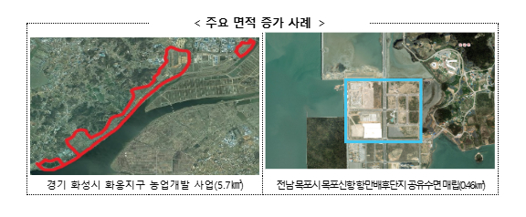 ㅇ 이는 여의도 면적(2.9㎢)의 약 4.3배에 달하는 크기로, 화성시 화옹지구 농업개발사업, 목포신항 항만배후단지 공유수면 매립 등 지속적인 토지개발사업으로 국토의 면적이 증가한 것으로 조사되었다. <참고 1>