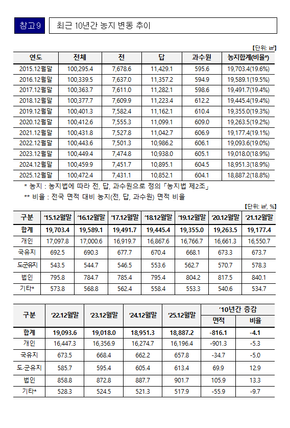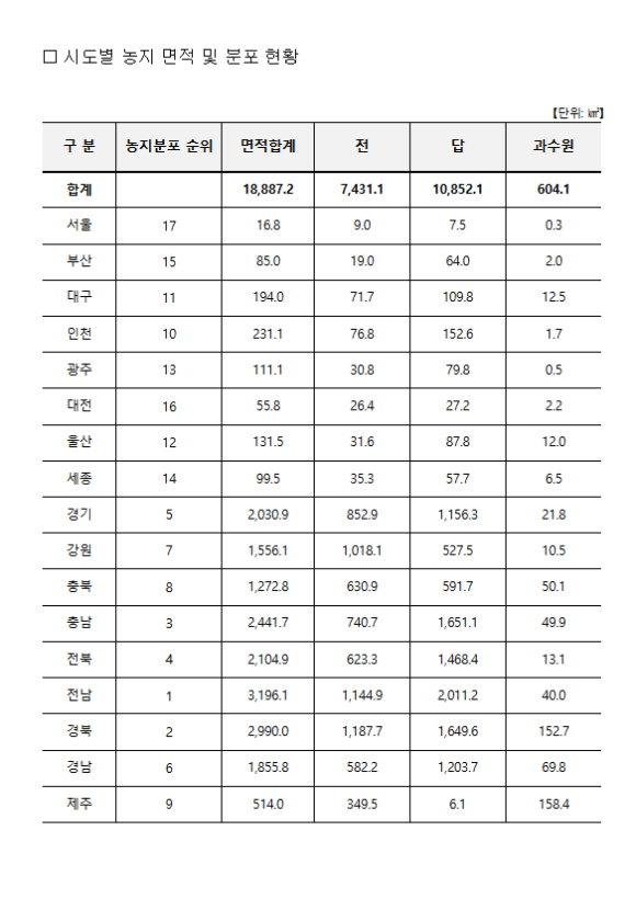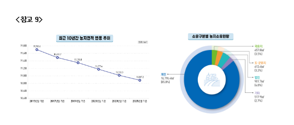 ㅇ 17개 시·도 중 전라남도 3,196.1㎢, 경상북도 2,990㎢, 충청남도 2,441.7㎢ 순으로 농지를 많이 보유하고 있으며, 전체 농지의 86%(16,196.4㎢)를 개인이 소유하고 있는 것으로 나타났다.