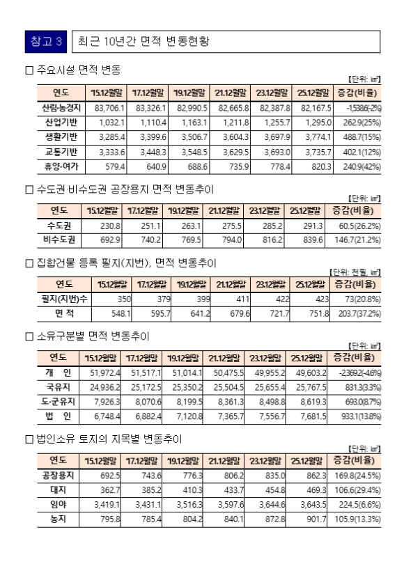 ㅇ 생활기반 시설(대, 학교용지) 면적은 488.7㎢(15%), 산업기반 시설(공장용지, 창고용지) 면적은 262.9㎢(25%), 교통기반 시설(도로, 철도, 주차장, 주유소) 면적은 402.1㎢(12%), 휴양·여가 시설(공원, 체육용지, 유원지) 면적은 240.9㎢(42%) 각각 증가하였다. <참고 3>