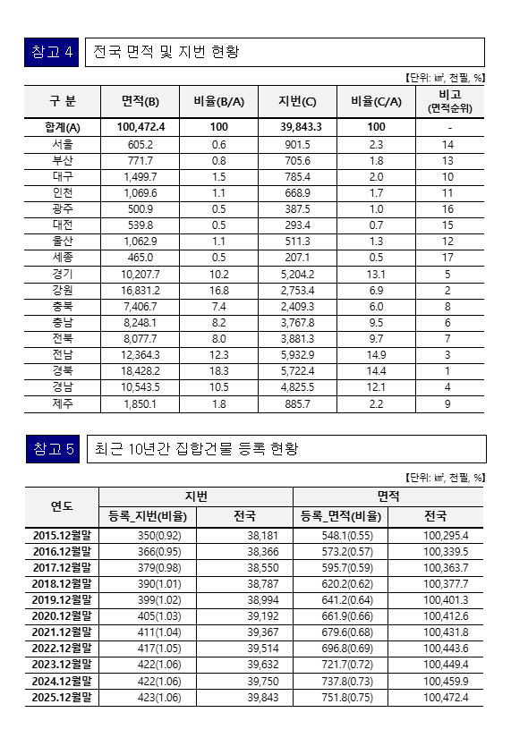 □ 국토교통부(장관 김윤덕)는 국토정책 수립과 행정업무 활용에 기초가 되는「2026년 지적(地籍)통계」(’25.12.31.기준)를 3월 31일 공표한다.