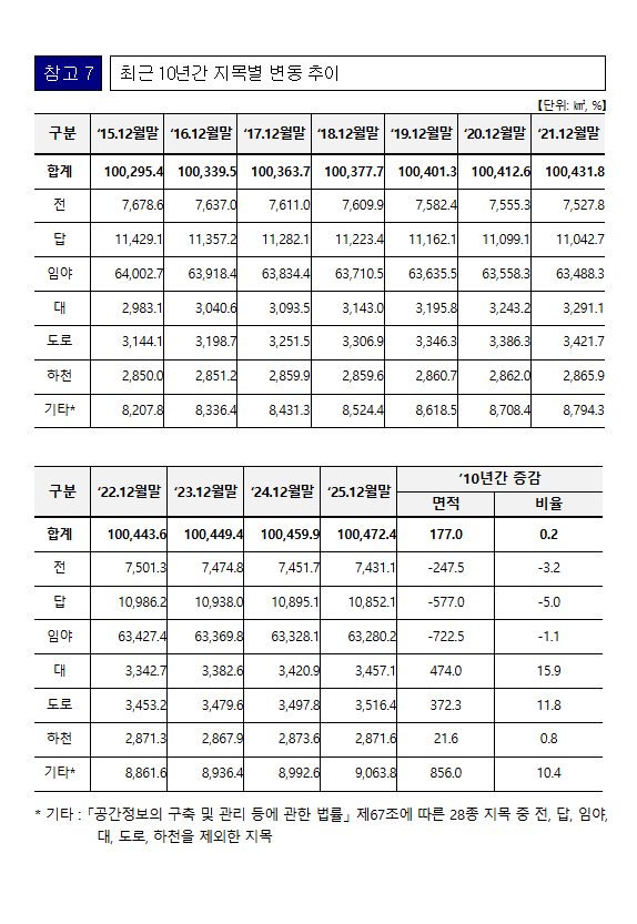 □ 산업화와 도시화로 인한 주거·산업용지와 기반시설 인프라 확충 등으로 산림·농지는 매년 감소하고 있으며, 지난 10년간 산림(722.5㎢)보다 농지(816.2㎢)가 더 많이 감소한 것으로 나타났다.