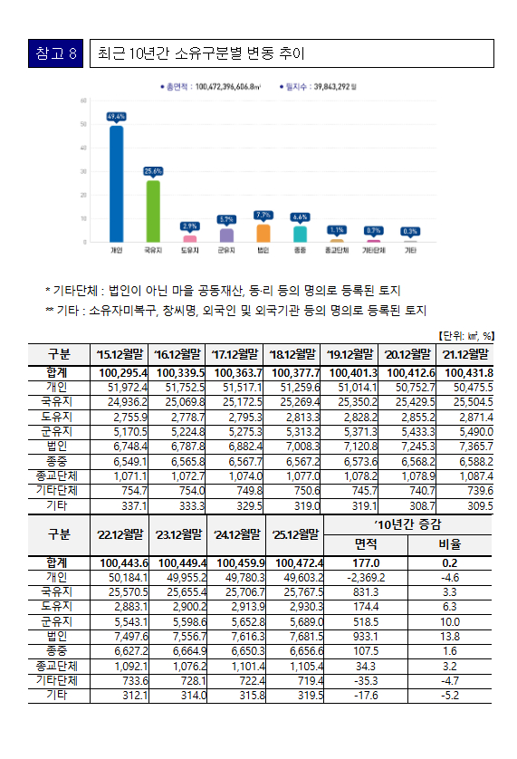 □ 지적통계가 작성된 이후 지적공부(토지정보등록부)에 등록된 토지의 면적은 매년 증가하고 있으며, ’25년 12월 31일 기준 등록 토지 면적은 토지개발 사업과 공유수면 매립 등 신규등록으로 전년 대비 12.5㎢ 증가하였다.