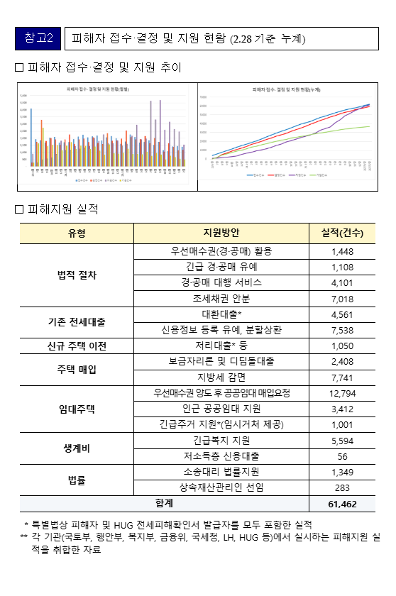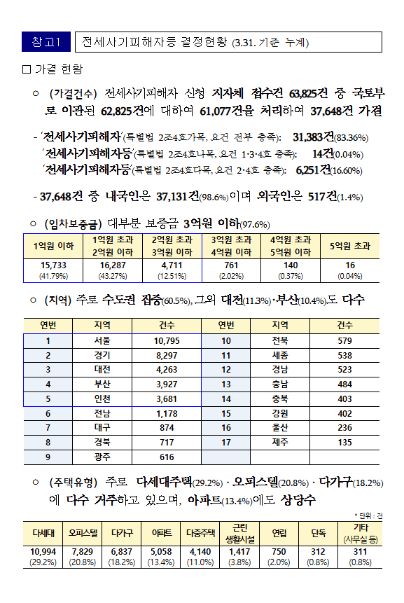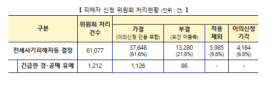 □ 그간 위원회에서 최종 결정한 전세사기피해자등은 총 37,648건(누계), 긴급 경・공매 유예 협조요청 결정은 총 1,126건(누계)으로, 결정된 피해자등에게는 주거, 금융, 법적 절차 등 총 61,462건(누계)을 지원하고 있다.