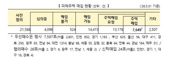 □ 현재까지 한국토지주택공사(이하 LH)의 전세사기 피해주택 매입실적은 7,649호(‘26.3.31 기준)이며, 특히 3월간 995호 매입하여 ’24년 매입 제도 도입 이후 월 단위 최다 매입 등 매입속도*도 증가하고 있다.