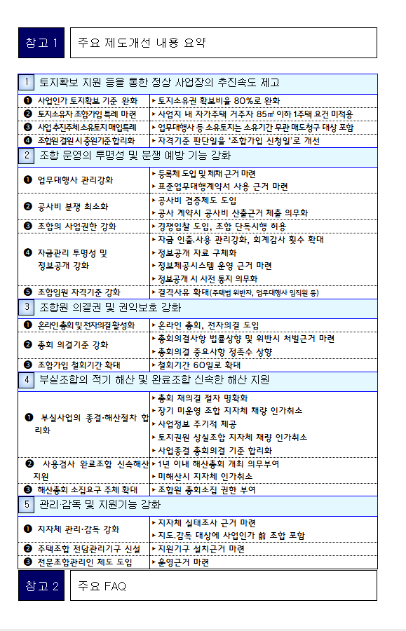- 특히, 시공사와의 공정한 계약관계가 이루어지도록 경쟁입찰을 의무화하고 시공사와 공동시행이 아닌 조합 단독으로도 사업을 시행할 수 있도록 할 계획이다.